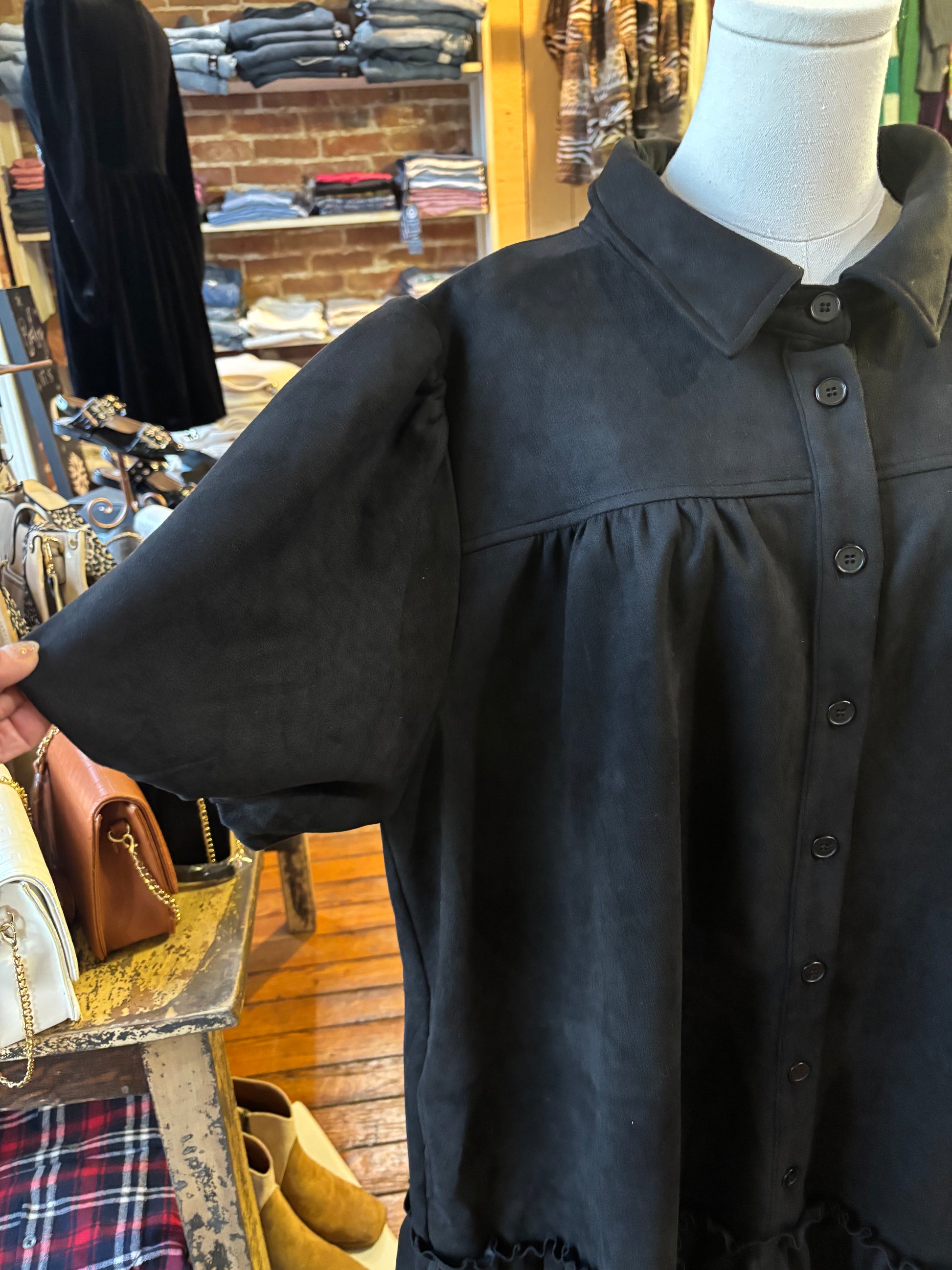 This beautiful Suede Black Dress is perfect for any outing.Features ruffle hem puffy sleeves with elastic band. Plus size
