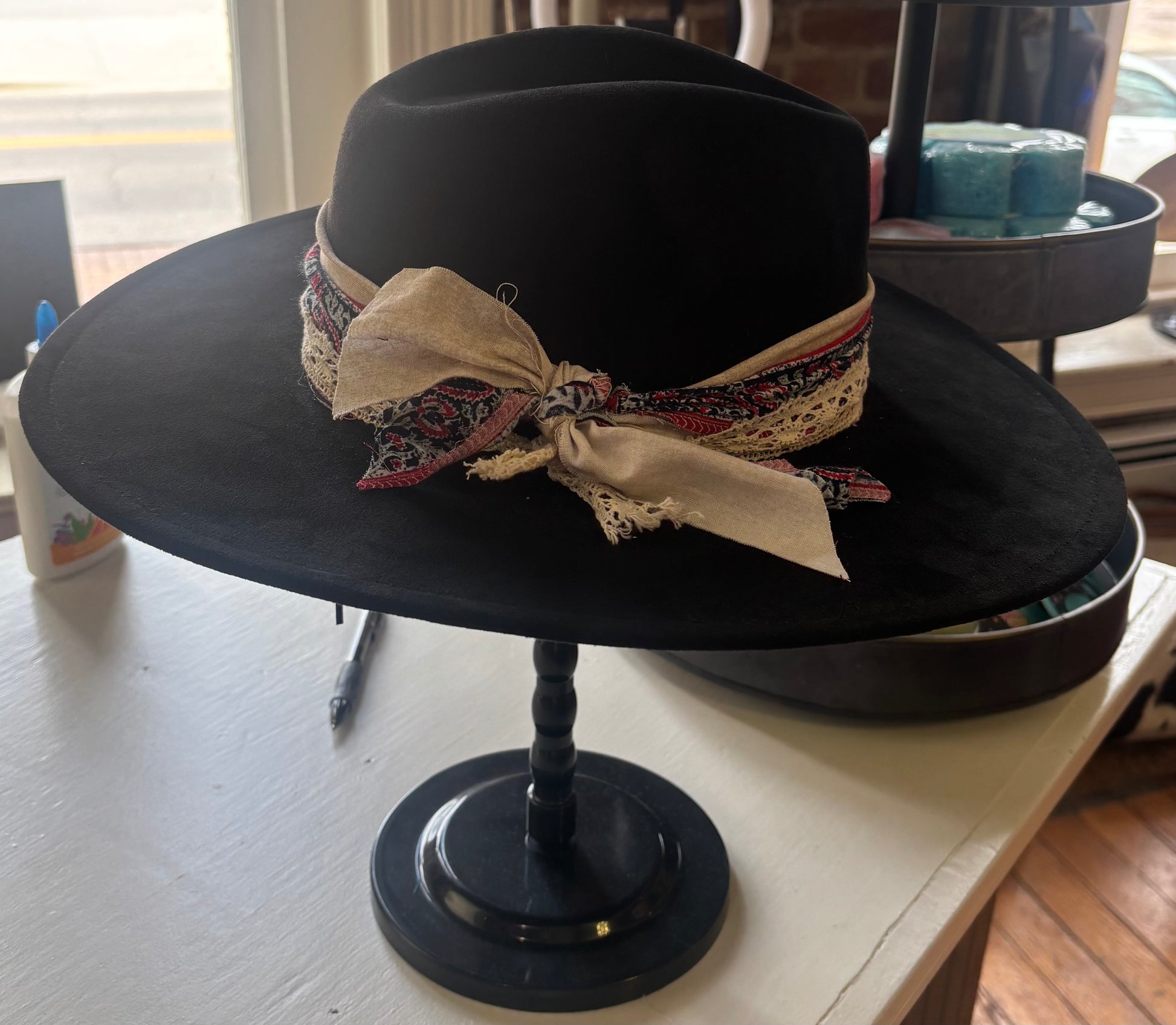 The Belle Bandit...Where Western grit meets rebel glam..THE BELLE BANDIT is a show-stopping black felt hat wrapped in a one of a kind mix paisley bandana,cream lace,and soft cotton--tied off in a fearless knot...
